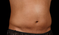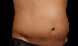 Photos non-retouchées avant et après de résultats 12 semaines après une séance de cryolipolyse Coolsculpting (Zeltiq) au niveau du ventre et des hanches.